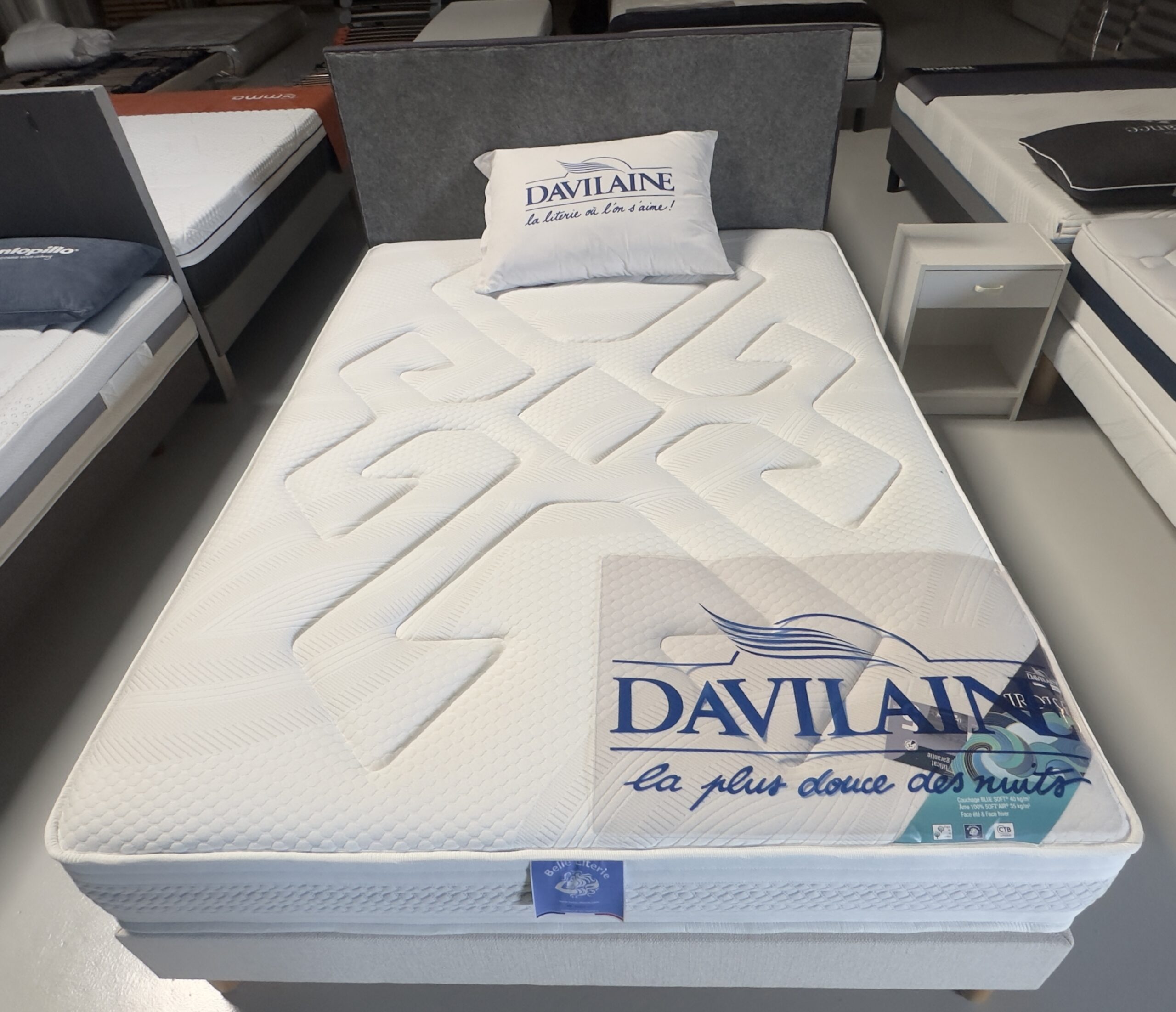 Matelas composé de deux couches de mousse haute résilience – L’assemblage de la mousse Soft’Air (densité 35 kg) et de la mousse Blue Soft (densité 40 kg) garantit un soutien ferme et un accueil moelleux et équilibré – Système NOVA Blanc et SANO Blanc offrant une aération périmétrale pour encore plus de confort et de douceur – Coutil Jersey 100 % polyester – Hauteur du matelas : 26 cm – Fabrication française – Garantie de 5 ans.